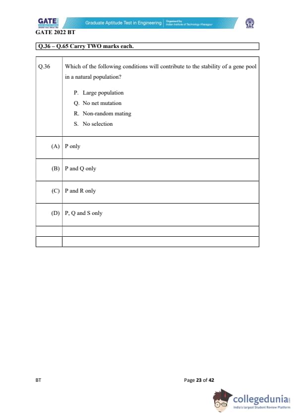 | 16 | Which of the following conditions will contribute to the stability of a gene pool in a natural population? (P) Large population (Q) No net mutation (R) Non-random mating (S) No selection (A) P only (B) P and Q only (C) P and R only (D) P, Q and S only | B | Large populations and no net mutation contribute to stability, while non-random mating can disrupt it. |