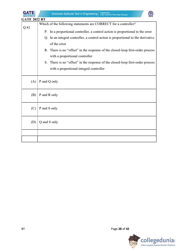 | 17 | Which of the following statements are CORRECT for a controller? (A) P and Q only (B) P and R only (C) P and S only (D) Q and S only | C | In a proportional controller, a control action is proportional to the error, and there is no “offset” with a proportional-integral controller. |