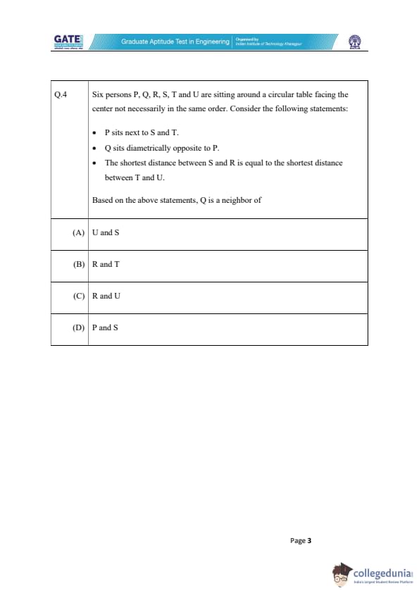 Six persons P, Q, R, S, T, and U are sitting around a circular table facing the center not necessarily in the same order. Consider the following statements: