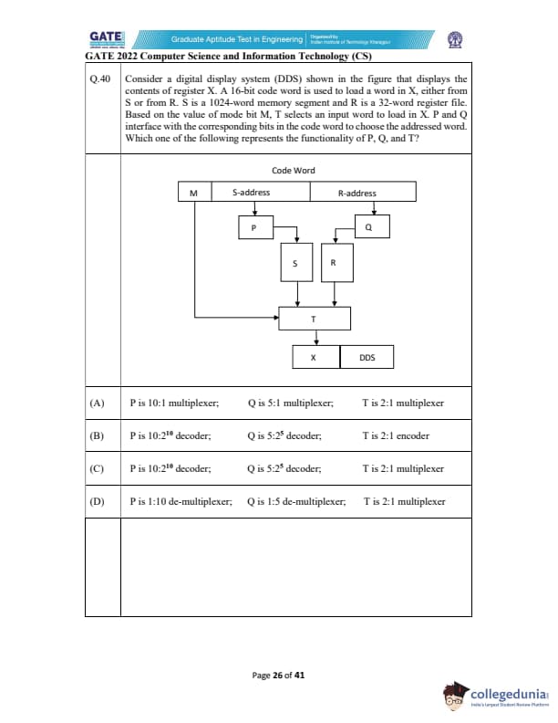 Consider a digital display system (DDS) shown in the figure that displays the contents of register X. A 16-bit code word is used to load a word in X, either from S or from R. S is a 1024-word memory segment and R is a 32-word register file. Based on the value of mode bit M, T selects an input word to load in X. P and Q interface with the corresponding bits in the code word to choose the addressed word. Which one of the following represents the functionality of P, Q, and T?