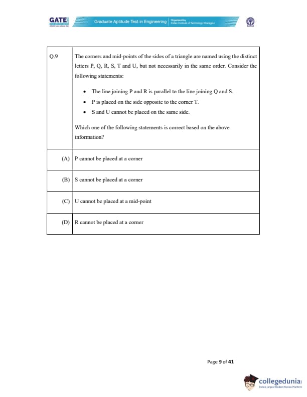 The corners and mid-points of the sides of a triangle are named using the distinct letters P, Q, R, S, T, and U, but not necessarily in the same order. Consider the following statements: