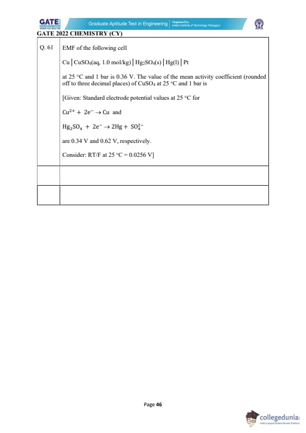 Thus, the mean activity coefficient of CuSO\(_4\) at 25°C and 1 bar is: \[ \boxed{0.044}. \] Quick Tip: To calculate the EMF of a cell under non-standard conditions, use the Nernst equation and consider the activity coefficients and concentrations.