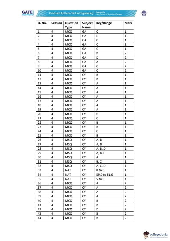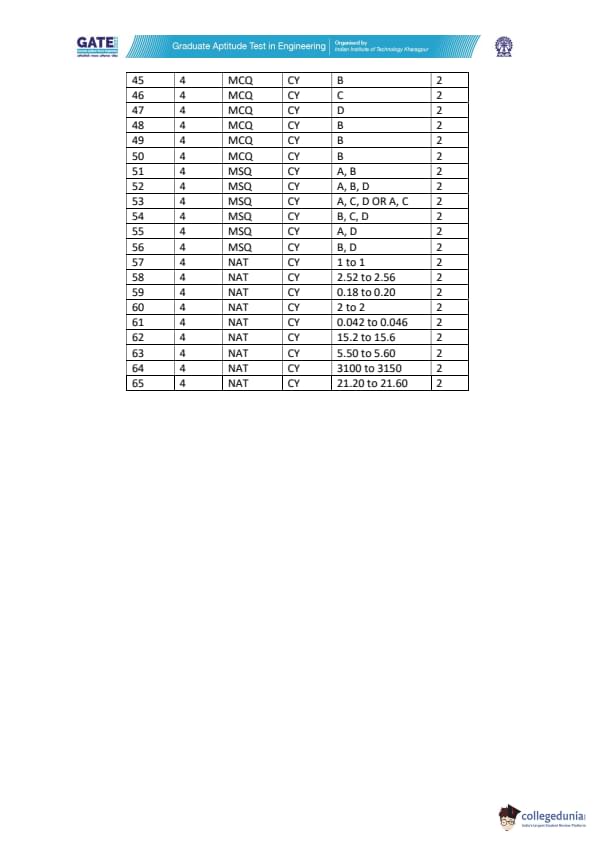 GATE 2022 Chemistry CY) Question Paper with Solutions PDFs are now available for download. GATE 2022 CY was successfully concluded by IIT Kharagpur on 6th February, 2022 in the Afternoon Session. A total of 180 minutes were allotted by IIT Kharagpur to solve GATE 2022 CY question paper. As reported by the candidates, the exam difficulty level was between moderate to difficult. There were 40 MCQs (Multiple Choice Questions), 12 NAT (Numerical Answer Type) questions, and 13 MSQs (Multiple Select Questions) in the question paper.