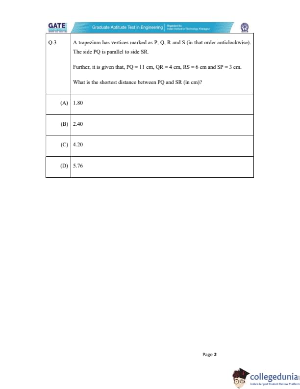 A trapezium has vertices marked as P, Q, R, and S (in that order anticlockwise). The side PQ is parallel to side SR. Further, it is given that, PQ = 11 cm, QR = 4 cm, RS = 6 cm, and SP = 3 cm. What is the shortest distance between PQ and SR (in cm)?