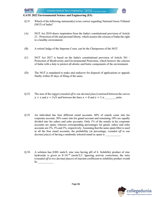 GATE 2022 Environmental Science and Engineering (ES) Question Paper with Solutions was successfully concluded on 6th February, 2022 by IIT Kharagpur. The overall difficulty level was rated moderate. Although students reviewed the question paper tougher as compared to last year. The question paper had three sections General Aptitude, Engineering Mathematics, and Environmental Science based questions. Maximum weightage was carried by ES based questions.