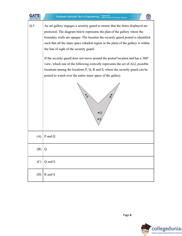 If the security guard does not move around the posted location and has a 360° view, which one of the following correctly represents the set of ALL possible locations among the locations P, Q, R and S, where the security guard can be posted to watch over the entire inner space of the gallery?