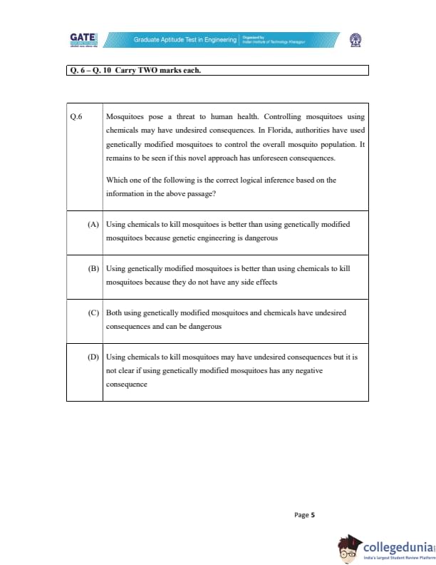 - Option (D): This option correctly reflects the passage, which states that chemicals may have undesired consequences, but it is unclear if genetically modified mosquitoes have any negative effects. Hence, option (D) is the correct answer. Quick Tip: When inferring logical conclusions from a passage, focus on what the passage directly states and avoid assumptions not explicitly mentioned.