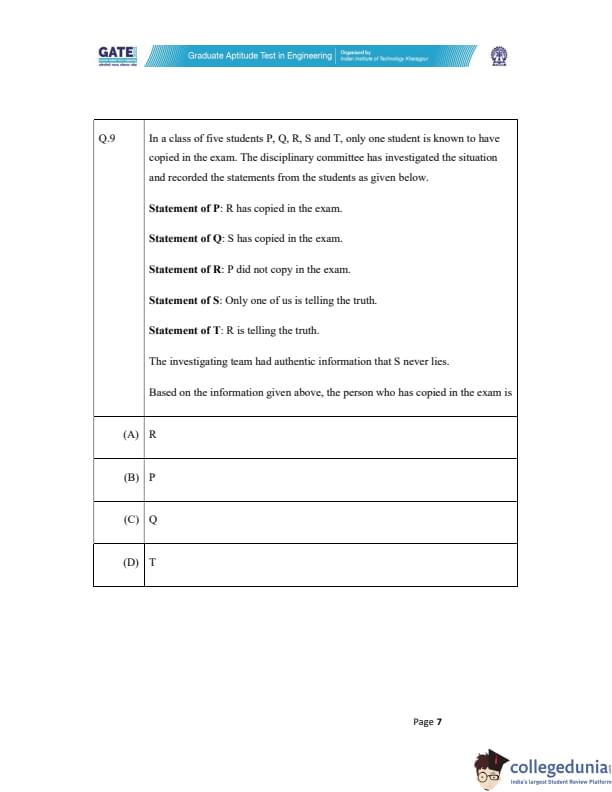 In a class of five students P, Q, R, S and T, only one student is known to have copied in the exam. The disciplinary committee has investigated the situation and recorded the statements from the students as given below.