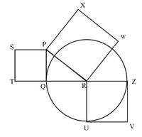 In the following diagram, the point R is the center of the circle. The lines PQ and ZV are tangential to the circle. The relation among the areas of the squares, PXWR, RUVZ and SPQT is