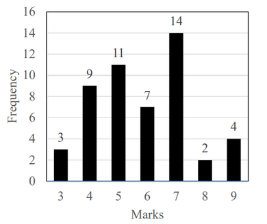 The above frequency chart shows the frequency distribution of marks obtained by a set of students in an exam.