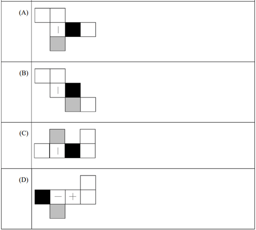 Consider a cube made by folding a single sheet of paper of appropriate shape. The interior faces of the cube are all blank. However, the exterior faces that are not visible in the above view may not be blank. Which one of the following represents a possible unfolding of the cube?