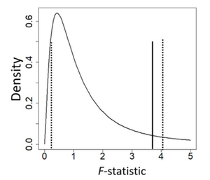 The figure shows an \(F\)-distribution with the observed \(F\)-statistic marked by the solid line. The two dotted vertical lines represent the critical values corresponding to a significance level of 0.05. This indicates a two-tailed \(F\)-test where we fail to reject the null hypothesis if the observed \(F\)-statistic falls between these two critical values.