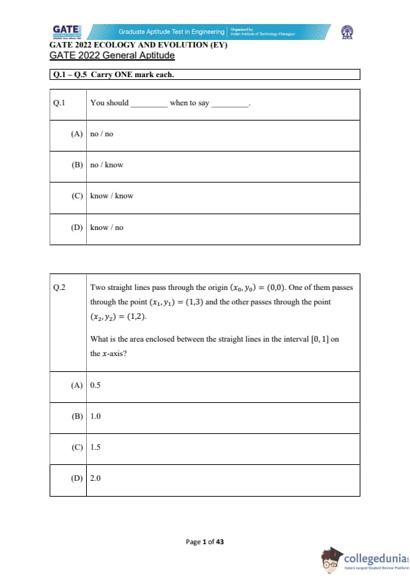 GATE 2022 Ecology and Evolution (EY) Question Paper with Solutions PDFs are now available on this page. IIT Kharagpur successfully concluded GATE 2022 EY on 12th February 2022 in the Forenoon Session (9:00 AM to 12:00 PM). The overall difficulty level of GATE 2022 EY was rated moderate. The question paper was distributed among two sections i.e General Aptitude and core Ecology and Evolution based questions. The General Aptitude section carried 10 questions, carrying 15% of the total weightage. The remaining 85% weightage was carried by the core EY section.
