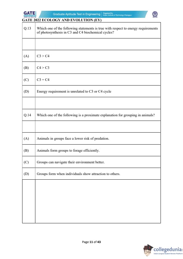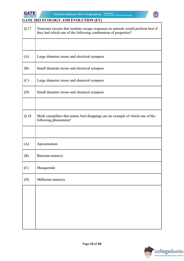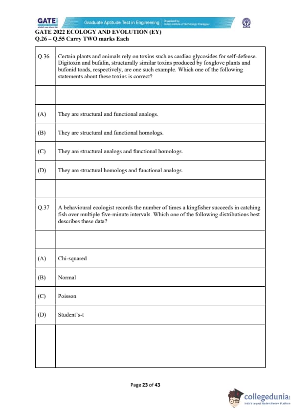 | GATE 2022 Ecology and Evolution (EY) Question Paper | Check Solutions |