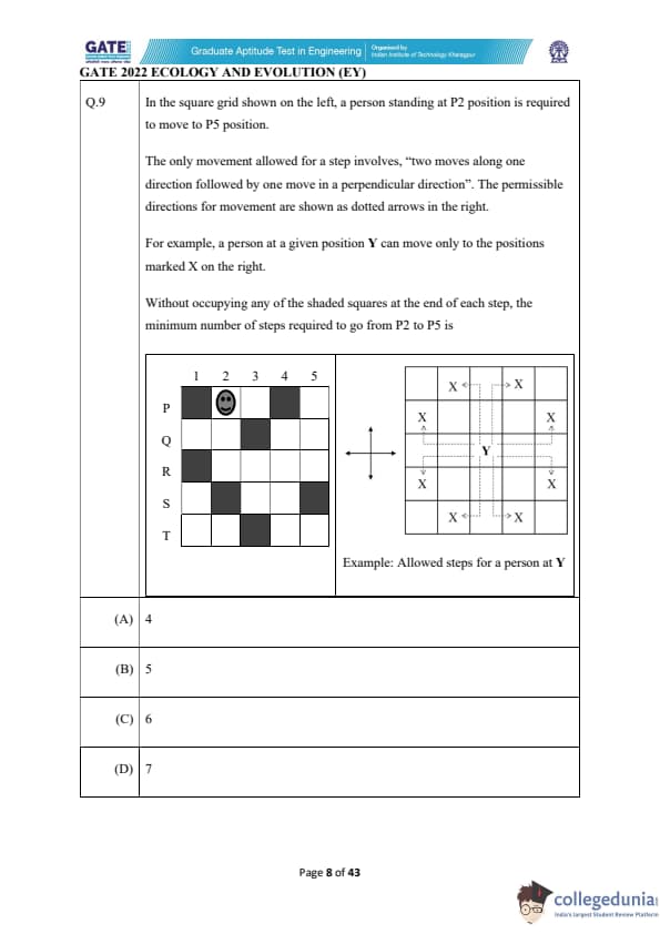 Thus, the correct answer is (B) 5. Quick Tip: To find the minimum number of steps, always plan the path in a way that minimizes backtracking and utilizes the allowed movement pattern efficiently.
