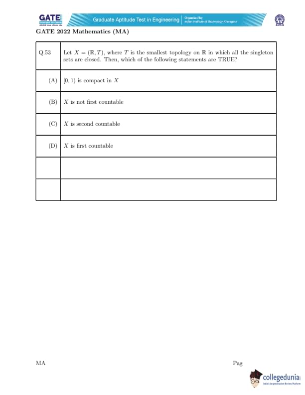 GATE 2022 Mathematics (MA) Question Paper with Solutions PDFs are available to download. GATE 2022 MA was held on 5th February, 2022 in the Afternoon Session (2:30 PM to 5:30 PM). The overall paper was rated easy to moderate in terms of difficulty level. Topics such as Topology, Real Analysis, and Calculus carried the highest weightage in GATE 2022 MA question paper. Algebra and Functional Analysis held the least weightage in the exam.