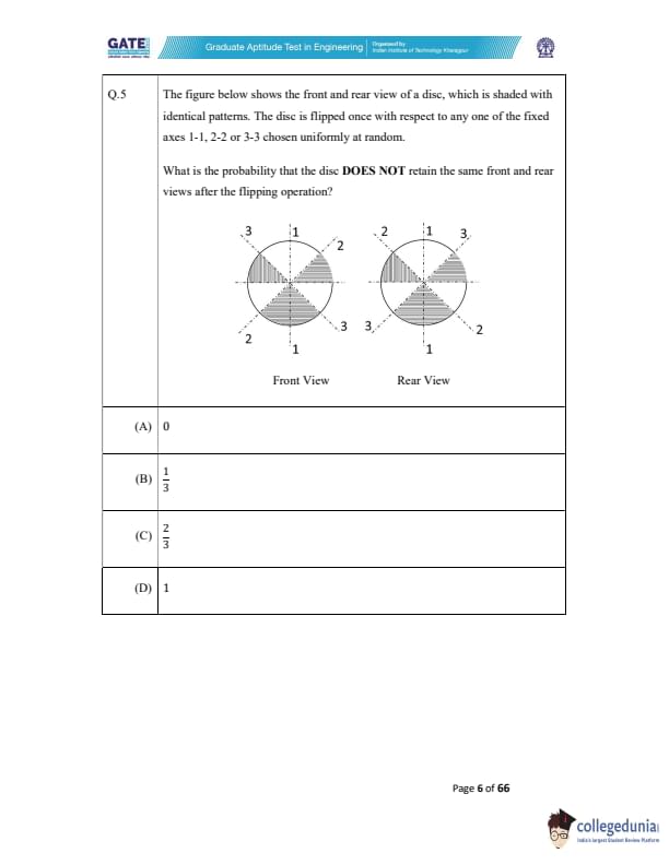 The figure below shows the front and rear view of a disc, which is shaded with identical patterns. The disc is flipped once with respect to any one of the fixed axes 1-1, 2-2, or 3-3 chosen uniformly at random.