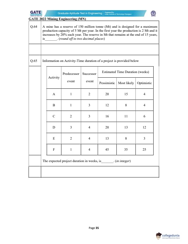 GATE 2022 Mining Engineering (MN) Question Paper with Solutions PDF is available for download here. GATE 2022 MN (Mining Engineering) Question Paper consisted of 65 questions in total including only the Multiple Choice Questions, and Numerical Answer Types. There were no MSQs asked in GATE 2022 MN Question Paper. However, the overall difficulty level of the GATE 2022 Mining Engineering Question paper was still rated as difficult by the aspirants.