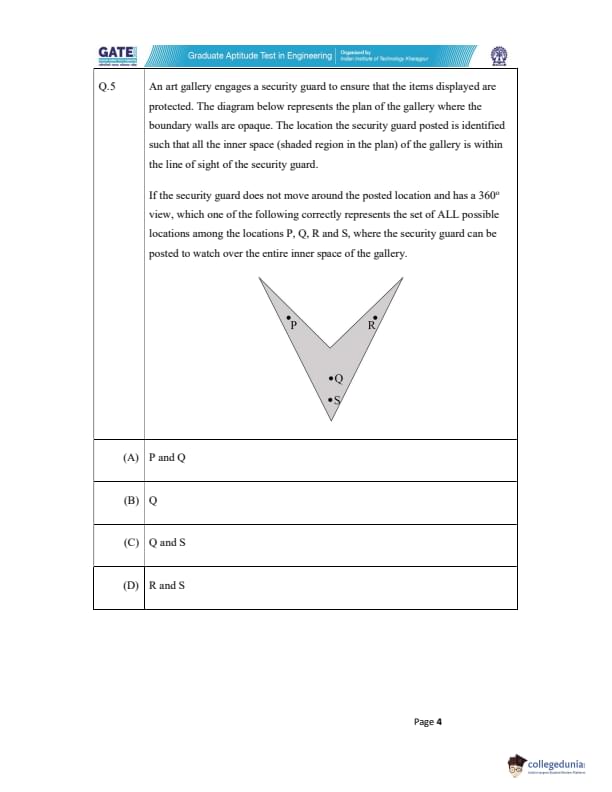 If the security guard does not move around the posted location and has a 360° view, which one of the following correctly represents the set of ALL possible locations among the locations P, Q, R and S, where the security guard can be posted to watch over the entire inner space of the gallery?