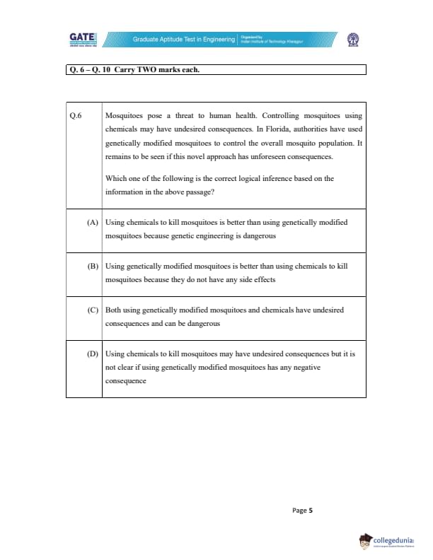 - Option (D): This option correctly reflects the passage, which states that chemicals may have undesired consequences, but it is unclear if genetically modified mosquitoes have any negative effects. Hence, option (D) is the correct answer. Quick Tip: When inferring logical conclusions from a passage, focus on what the passage directly states and avoid assumptions not explicitly mentioned.