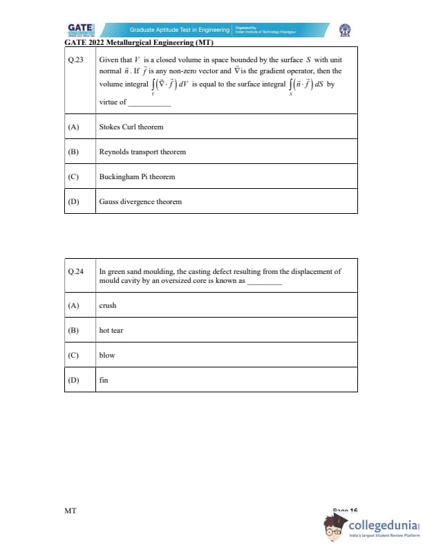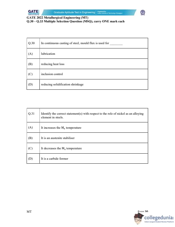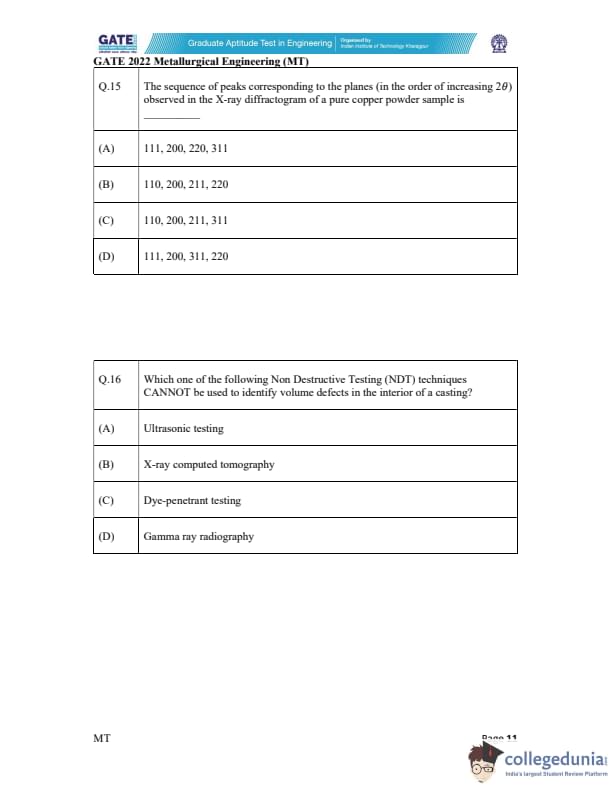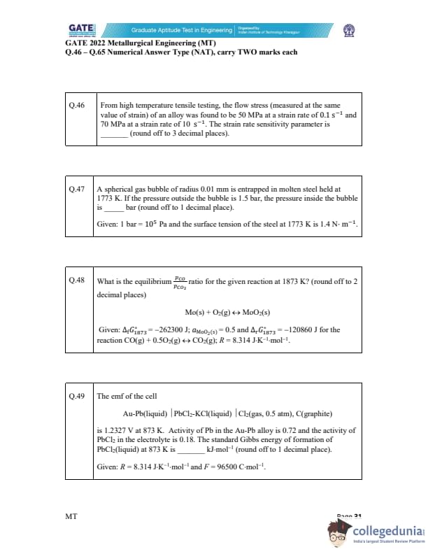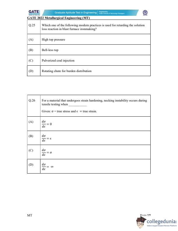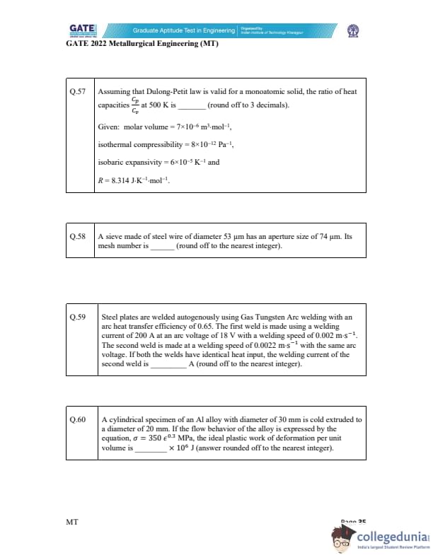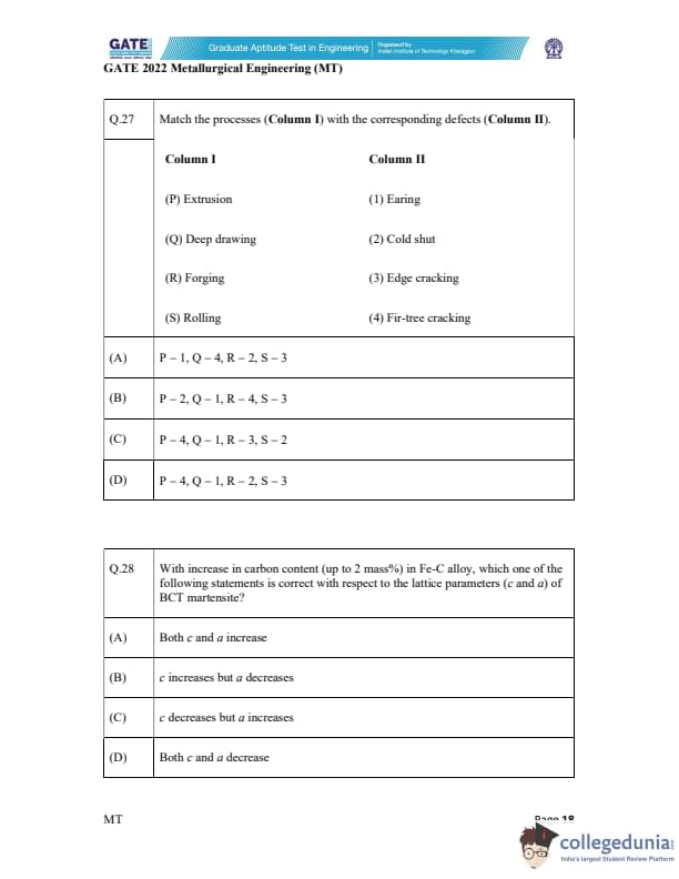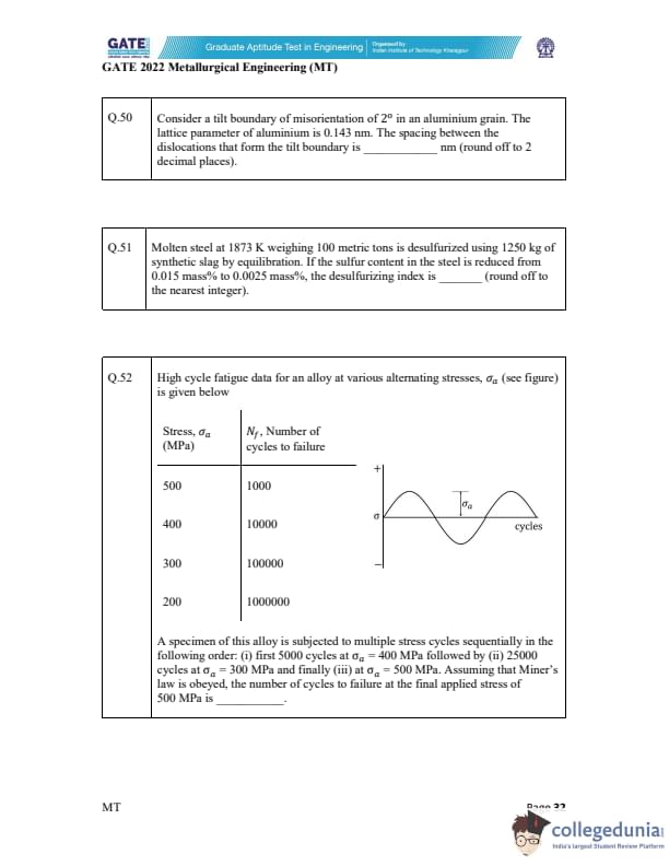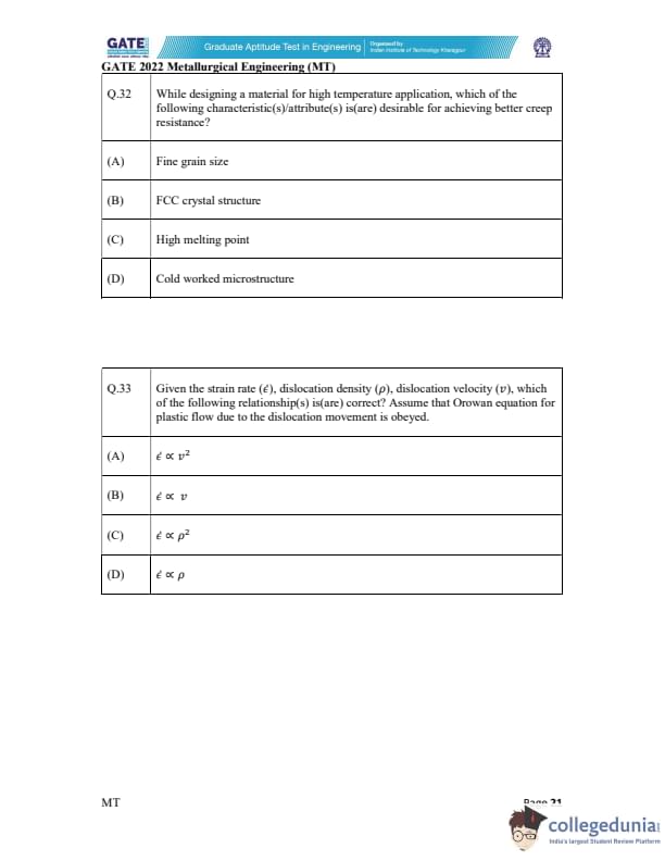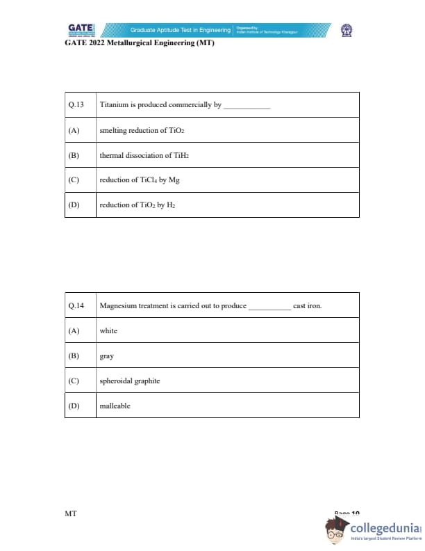 | GATE 2022 Metallurgical Engineering (MT) Question Paper | Check Solutions |