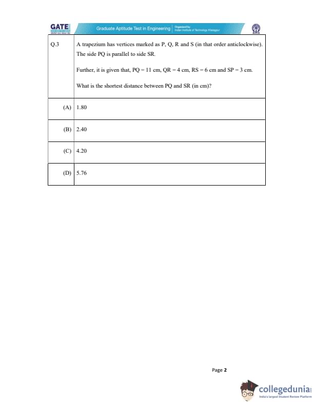 A trapezium has vertices marked as P, Q, R, and S (in that order anticlockwise). The side PQ is parallel to side SR. Further, it is given that, PQ = 11 cm, QR = 4 cm, RS = 6 cm, and SP = 3 cm. What is the shortest distance between PQ and SR (in cm)?