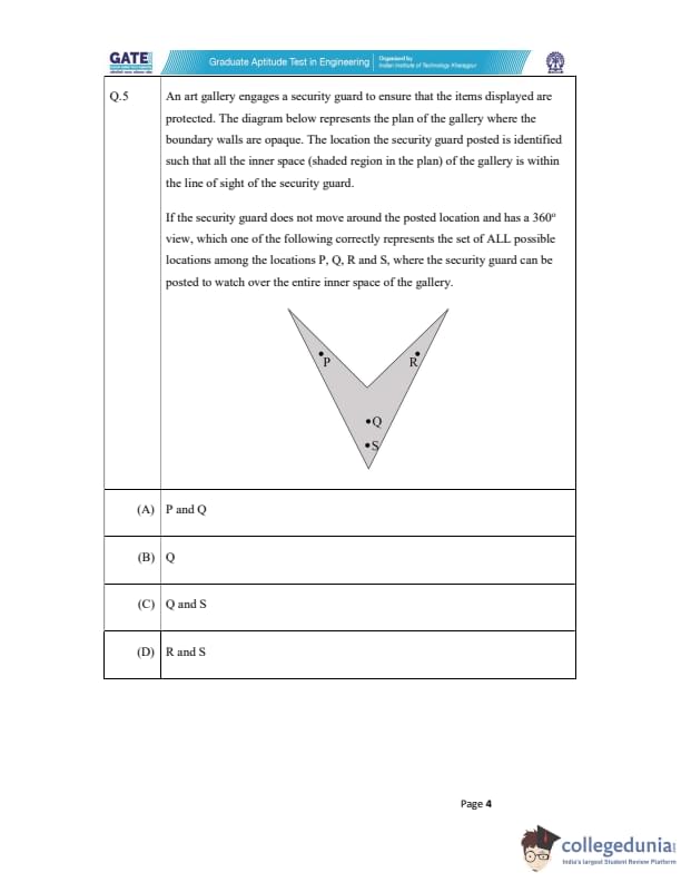 If the security guard does not move around the posted location and has a 360° view, which one of the following correctly represents the set of ALL possible locations among the locations P, Q, R and S, where the security guard can be posted to watch over the entire inner space of the gallery?