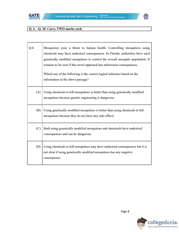 - Option (D): This option correctly reflects the passage, which states that chemicals may have undesired consequences, but it is unclear if genetically modified mosquitoes have any negative effects. Hence, option (D) is the correct answer. Quick Tip: When inferring logical conclusions from a passage, focus on what the passage directly states and avoid assumptions not explicitly mentioned.