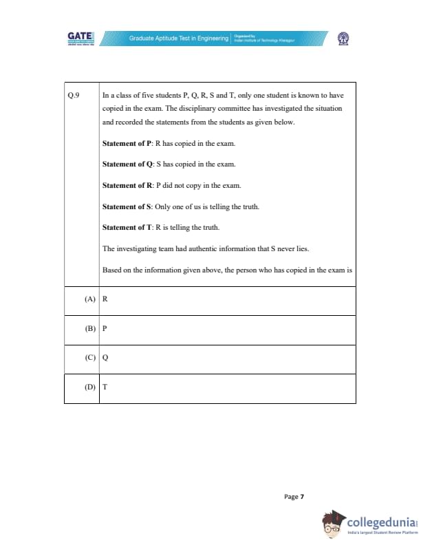 In a class of five students P, Q, R, S and T, only one student is known to have copied in the exam. The disciplinary committee has investigated the situation and recorded the statements from the students as given below.