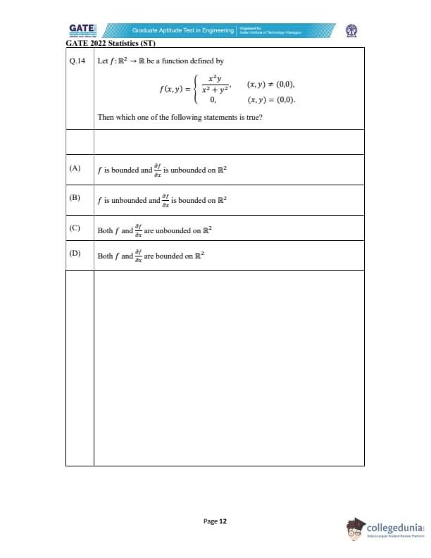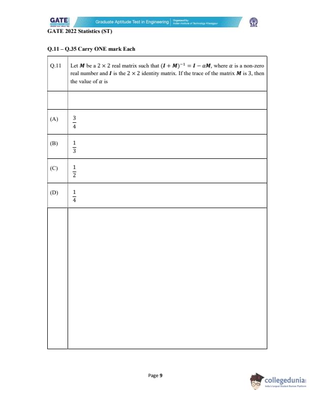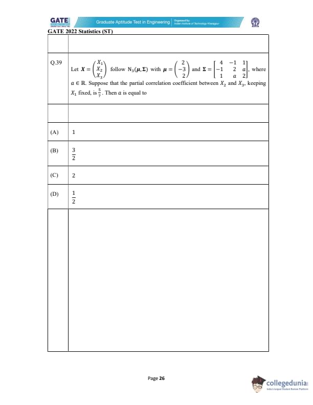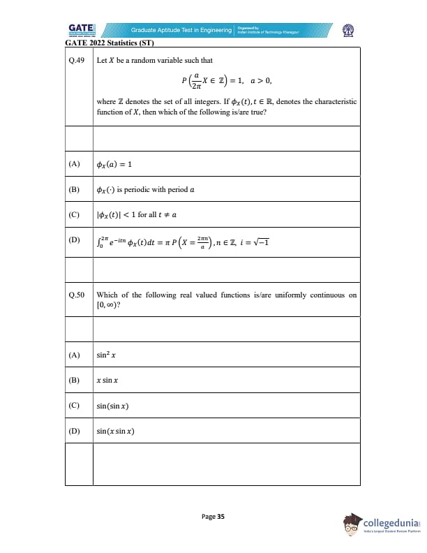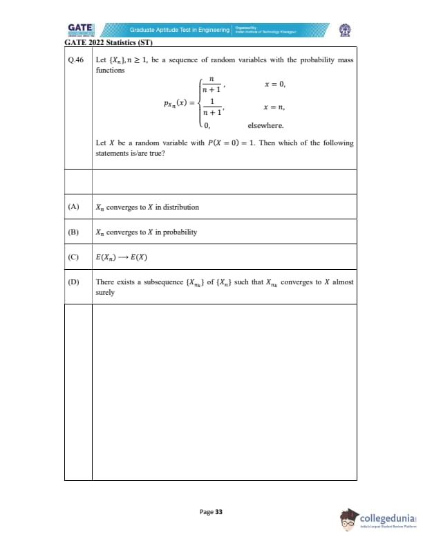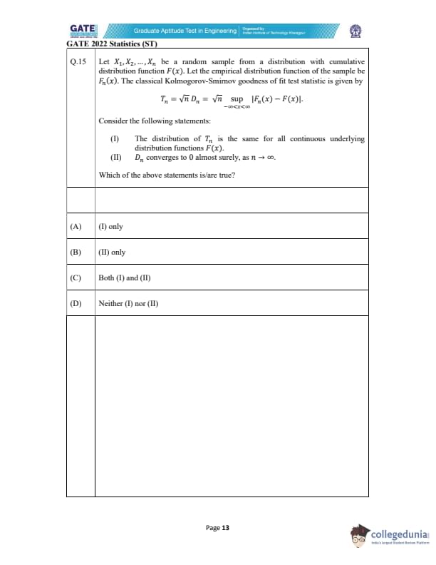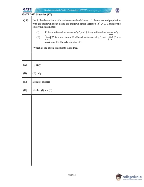 | GATE 2022 Statistics (ST) Question Paper | Check Solutions |