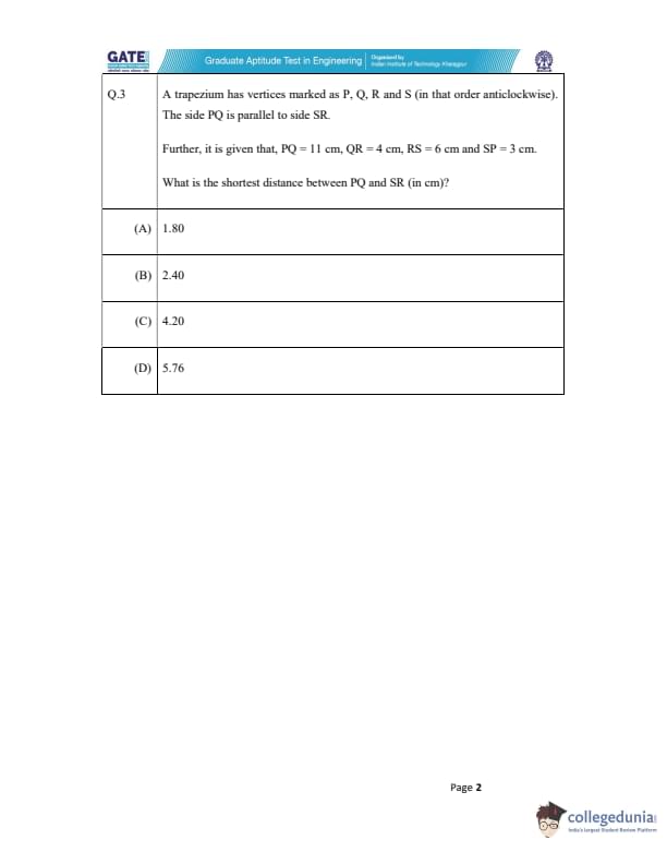 A trapezium has vertices marked as P, Q, R, and S (in that order anticlockwise). The side PQ is parallel to side SR. Further, it is given that, PQ = 11 cm, QR = 4 cm, RS = 6 cm, and SP = 3 cm. What is the shortest distance between PQ and SR (in cm)?