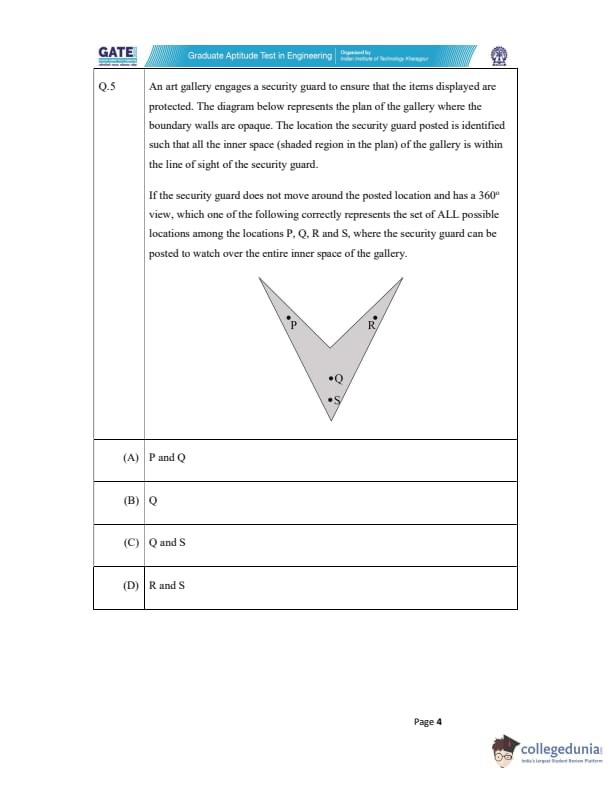 If the security guard does not move around the posted location and has a 360° view, which one of the following correctly represents the set of ALL possible locations among the locations P, Q, R and S, where the security guard can be posted to watch over the entire inner space of the gallery?