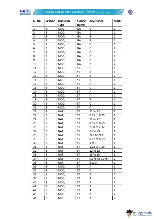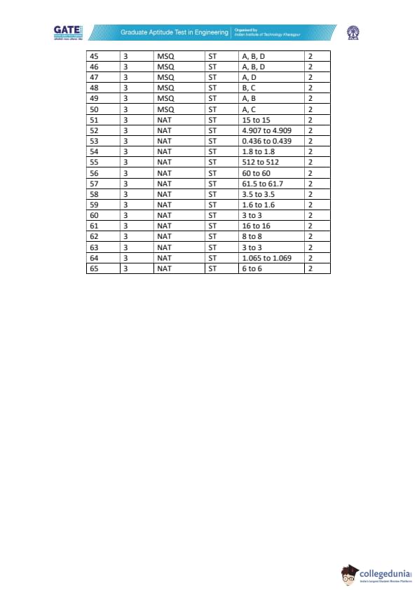 IIT Kharagpur listed MCQs (Multiple Choice Questions), MSQs (Multiple Select Questions), NATs (Numerical Answer Type) questions to constitute the question paper of GATE 2022 ST. Have a look at the below-mentioned table in order to get details of questions as per the carried marks-