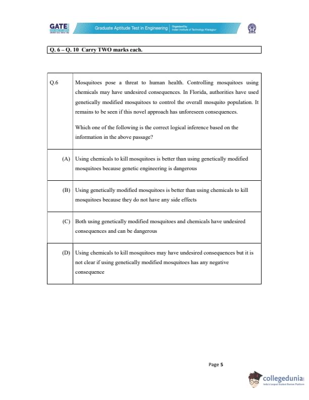 - Option (D): This option correctly reflects the passage, which states that chemicals may have undesired consequences, but it is unclear if genetically modified mosquitoes have any negative effects. Hence, option (D) is the correct answer. Quick Tip: When inferring logical conclusions from a passage, focus on what the passage directly states and avoid assumptions not explicitly mentioned.