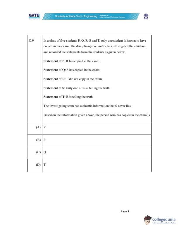 In a class of five students P, Q, R, S and T, only one student is known to have copied in the exam. The disciplinary committee has investigated the situation and recorded the statements from the students as given below.