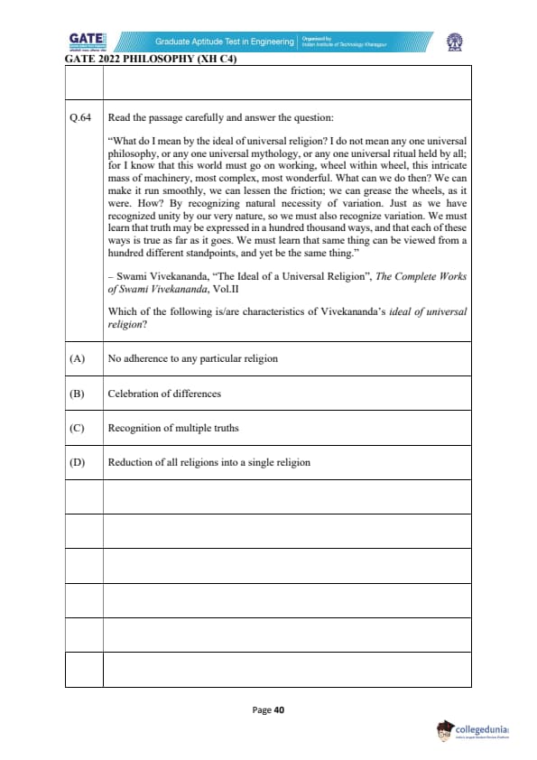 The correct answers are (A) and (B) because Vivekananda’s universal religion involves non-adherence to any one religion and celebrates differences in the expressions of truth. Quick Tip: Vivekananda’s ideal of universal religion emphasizes respect for the diverse ways in which truth is expressed and encourages openness to multiple standpoints.