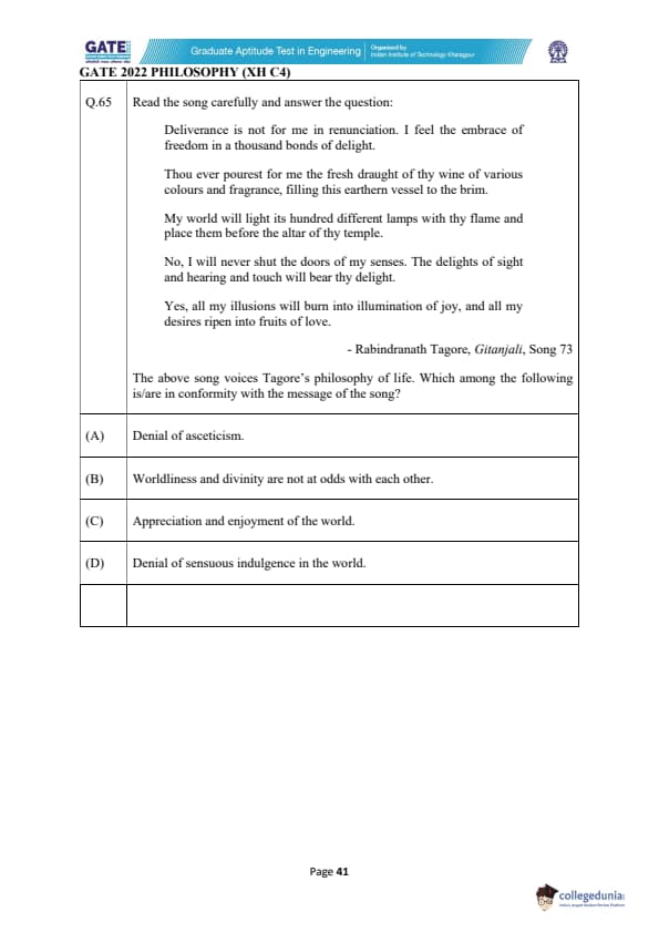 The correct answers are (A), (B), and (C), as they align with the song’s message of embracing the world and its pleasures as expressions of divine presence. Quick Tip: Tagore’s philosophy in Gitanjali emphasizes the unity of the divine and the worldly, rejecting asceticism and advocating for the appreciation of sensory experiences as part of spiritual fulfillment.