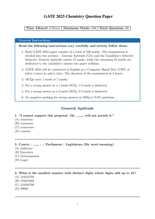 | GATE 2023 Chemistry Question Paper with Solutions PDF | Download PDF | Check Solutions |