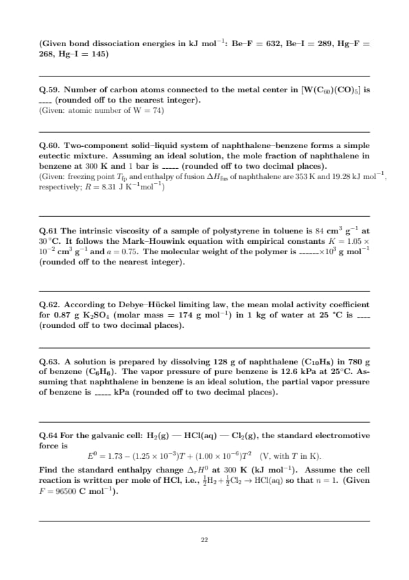 Step 3: Insert \(n=1\). \[ \Delta H^0 = -(96500)(1.445) + (96500)(300)(-6.5\times10^{-4}) = -1.394\times10^{5} - 1.882\times10^{4}\ J mol^{-1} \] \[ = -1.5826\times10^{5}\ J mol^{-1} \approx -1.58\times10^{5}\ J mol^{-1} = \boxed{-158\ kJ mol^{-1}}. \] Quick Tip: For EMF that depends on \(T\): \(\Delta H^0=-nF\big[E^0 - T(dE^0/dT)\big]\). Be clear whether the cell reaction is written per mole of product (here, per mole of HCl so \(n=1\)) or for the full \(2e^-\) process.