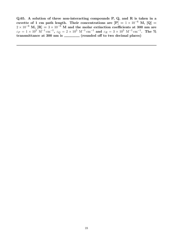A solution of three non-interacting compounds P, Q, and R is taken in a cuvette of 1 cm path length. Their concentrations are [P] = \(1\times10^{-6}\) M, [Q] = \(2\times10^{-6}\) M, [R] = \(3\times10^{-6}\) M and the molar extinction coefficients at 300 nm are \(\varepsilon_P = 1\times10^{5}\ \mathrm{M^{-1}\,cm^{-1}}\), \(\varepsilon_Q = 2\times10^{5}\ \mathrm{M^{-1}\,cm^{-1}}\) and \(\varepsilon_R = 3\times10^{5}\ \mathrm{M^{-1}\,cm^{-1}}\). The % transmittance at 300 nm is ___________ (rounded off to two decimal places)