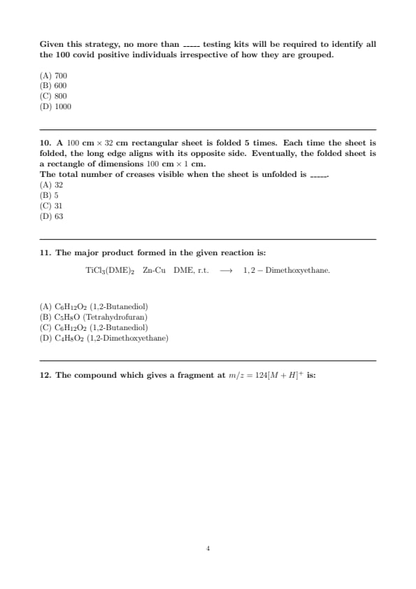 The fragment at \(m/z = 124\) corresponds to a specific molecular weight, and by examining the structures of the compounds and their likely fragmentation patterns, Compound B matches the observed mass for the fragment ion at \(m/z = 124 [M+H]^+\). Quick Tip: In mass spectrometry, identifying the correct fragmentation pattern requires understanding the molecular structure and typical mass loss during ionization. Compounds with similar molecular weights can often yield different fragment ions based on their structural features.