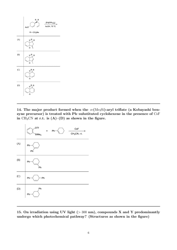 The major product formed when the \(\,o\)-(\(\mathrm{Me_3Si}\))-aryl triflate (a Kobayashi benzyne precursor) is treated with Ph–substituted cyclohexene in the presence of \(\mathrm{CsF}\) in \(\mathrm{CH_3CN}\) at r.t. is (A)–(D) as shown in the figure.