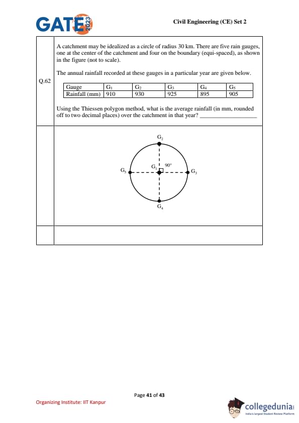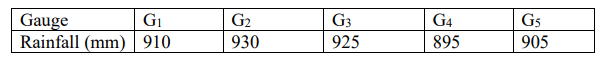 Thus, the average rainfall over the catchment in that year is approximately 912.28 mm (rounded to two decimal places). Quick Tip: To calculate the average rainfall using the Thiessen polygon method, simply take the weighted average where each rain gauge is weighted equally, as they represent equal portions of the catchment area.