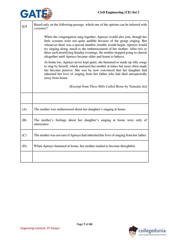 \[ \boxed{When Apenyo hummed at home, her mother tended to become thoughtful.} \] Quick Tip: When answering inference questions, focus on what is stated explicitly or strongly implied in the passage. Words like “most often” or “convinced” provide certainty, while options using “only” or contradicting the text can be eliminated.