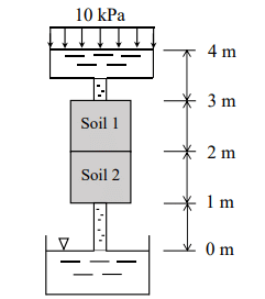 Soil 2: \(L_2=1\) m, \(k_2=1\) mm/s \(=0.001\) m/s \(\Rightarrow R_2=L_2/k_2=1/0.001=1000\).