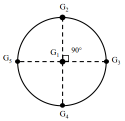 A catchment may be idealized as a circle of radius 30 km. There are five rain gauges, one at the center of the catchment and four on the boundary (equi-spaced), as shown in the figure (not to scale). The annual rainfall recorded at these gauges in a particular year are given below.