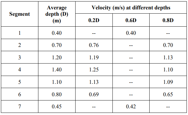 - Velocity at 0.2D, 0.6D, and 0.8D for each segment.