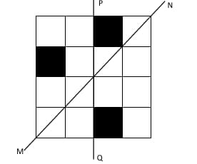 The figure consists of 16 unit squares (4×4 grid). Three squares are already black. In addition to these, what is the minimum number of squares that must be coloured black so that both \(PQ\) (vertical axis) and \(MN\) (diagonal axis) are lines of symmetry?