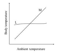 The figure shows body temperature vs. ambient temperature for two species (L and M). Which statement about temperature regulation is correct?