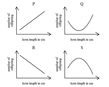Horn length typically varies from \(10\) cm to \(50\) cm. Which graph (P, Q, R, S) correctly represents this relationship?